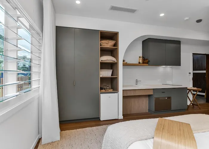 Oasis Apartments And Treetop Houses i Byron Bay erbjuder gästerna 24 rum med plattskärms-TV med satellitkanaler och flerkanals TV, samt bekvämligheter som strykjärn med strykbräda, strykutrustning och luftkonditionering. Rummen har fullstort kylskåp, frys och spishäll, och det finns en separat toalett och en dusch i badrummen. Du kan njuta av utsikten över innergården i rummen.